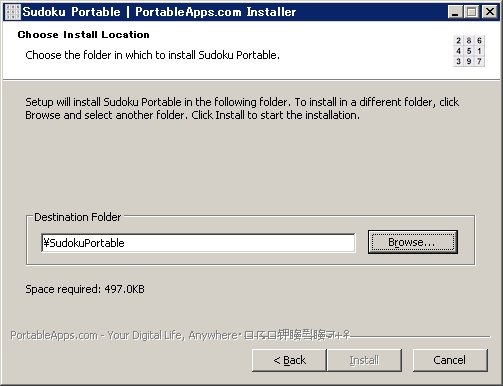 Sudoku Portable 1.1.7.2 Released | PortableApps.com - Portable software for USB driveshttp://portableapps.com/news/2008-03-24_-_sudoku_portable_1.1.7.2インストール不要のポータブル版です。