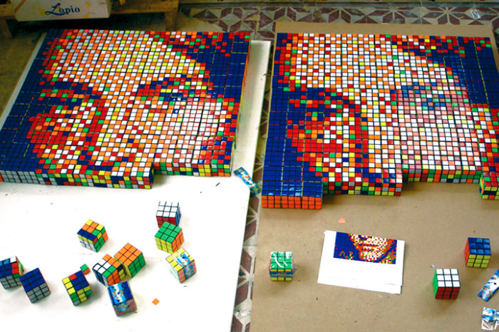それにしても、ルービックキューブで絵を描くとなると、まずはどんな配色にするか考え、その上でルービックキューブを思い通りの配色に組あわせていく必要があるわけで、かなりの絵応力が必要そうです。どうでもいいけど、この人、いくつぐらいのルービックキューブを持っているんでしょうねぇ。