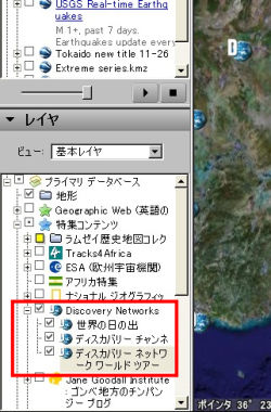 Google Earth(グーグルアース)起動後、左側のレイヤーの内にある、「特集コンテンツ→Discovery Networks」にチェックを入れる(下画像を参照)