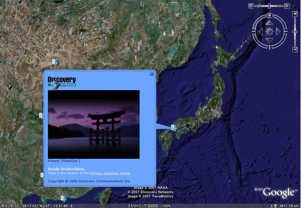 Google Earth(グーグルアース)に新しいレイヤーが加わりました。どうやらDiscovery Networks と連携したレイヤーのようです。この新しいレイヤーで、世界各地の日の出をはじめ、遺跡や風習に関する動画を見ることが出来ます。