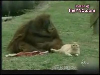 オラウータンに一発バシッと殴られてしまった猫の動画。マンガのように手足がのびてます。ネコ好きな人は見ないほうがいいかも…。