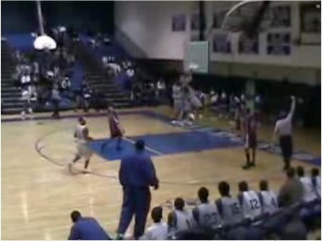 アメリカでしょうか?高校生のバスケットボールの試合で、3人一緒にダンクシュートをして、ゴールを見事に破壊しています。