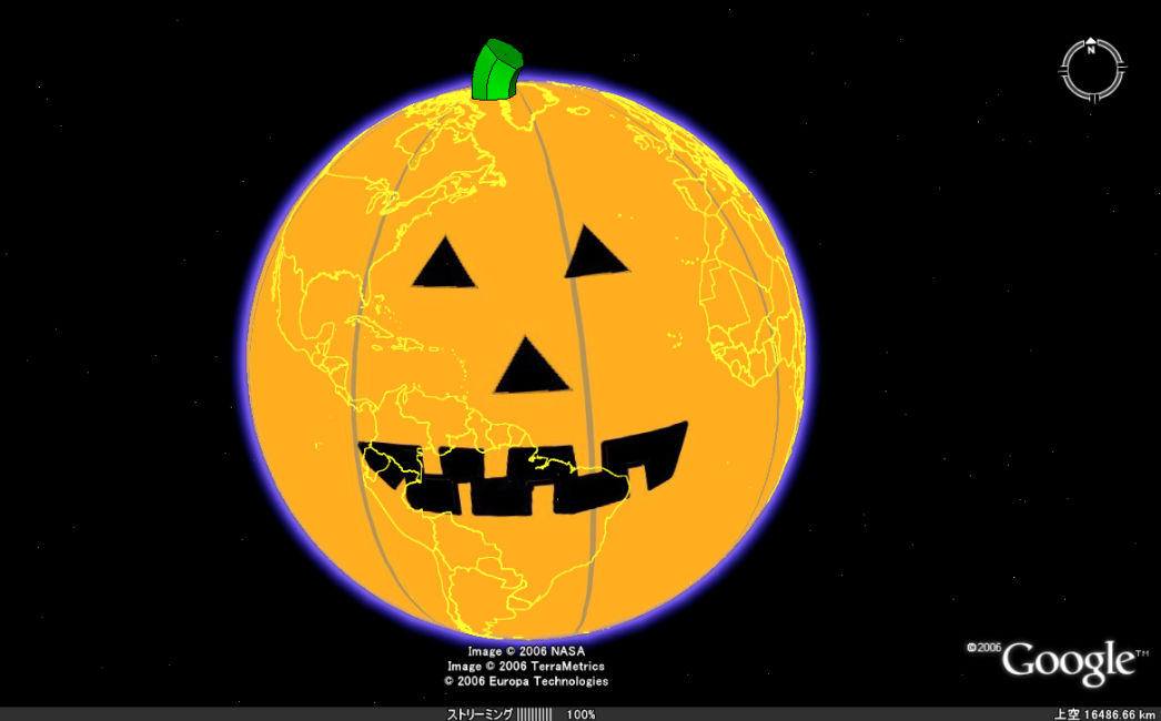 Google Earth(グーグルアース)を使った、ハローウィンのカボチャが登場(下の画像。クリックで拡大します)。地球そのものをカボチャに見立てています。ある意味地球最大のパンプキンかも…?
