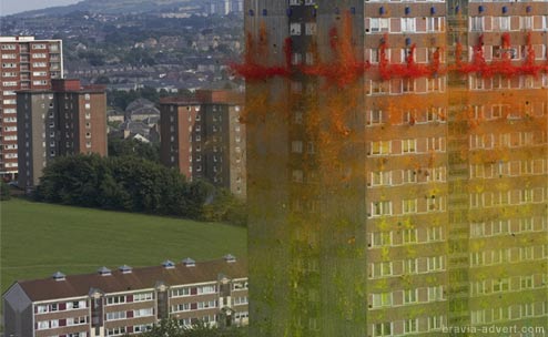 建物にペンキを設置して、一気にそれを爆発させているそうです。撮影にかかった日数と人手は10日、250人。掃除にも5日、60人かけています。この動画を見るには下のページの「The Ad」のページから。ページ開くのに、少し時間がかかります(Quick Time が必要)↓